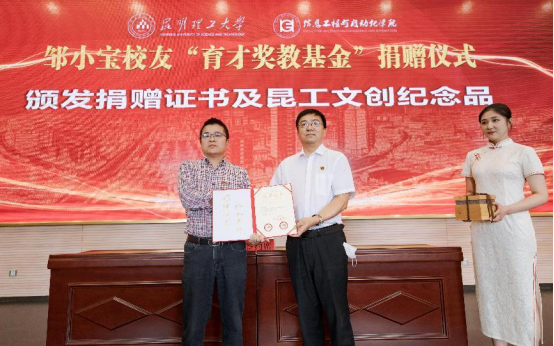 校党委降富楼副书记为邹小宝校友颁发了捐赠证书和昆工文创纪念品。