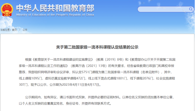 2023年4月11日,教育部发布《关于第二批国家级一流本科课程认定结果的公示》。