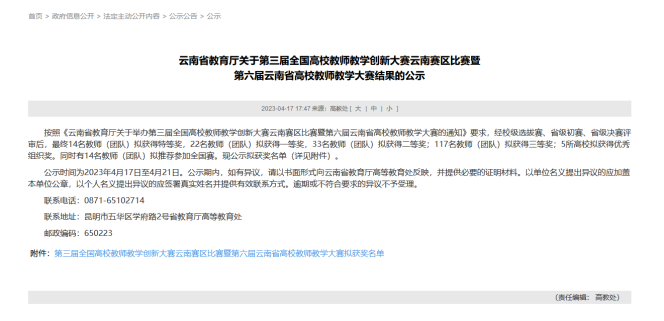 4月17日,云南省教育厅发布了《云南省教育厅关于第三届全国高校教师教学创新大赛云南赛区比赛暨第六届云南省高校教师教学大赛结果的公示》。看片狂人