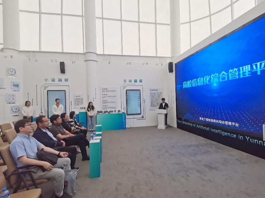 王伟超一行首先前往云南省人工智能重点实验室进行走访参观,实验室工作人员为王伟超一行介绍了团队科研成果以及建设规划,并给各位到访人员作了产品介绍及功能演示,王伟超对学院所取得的科研成就表示祝贺。