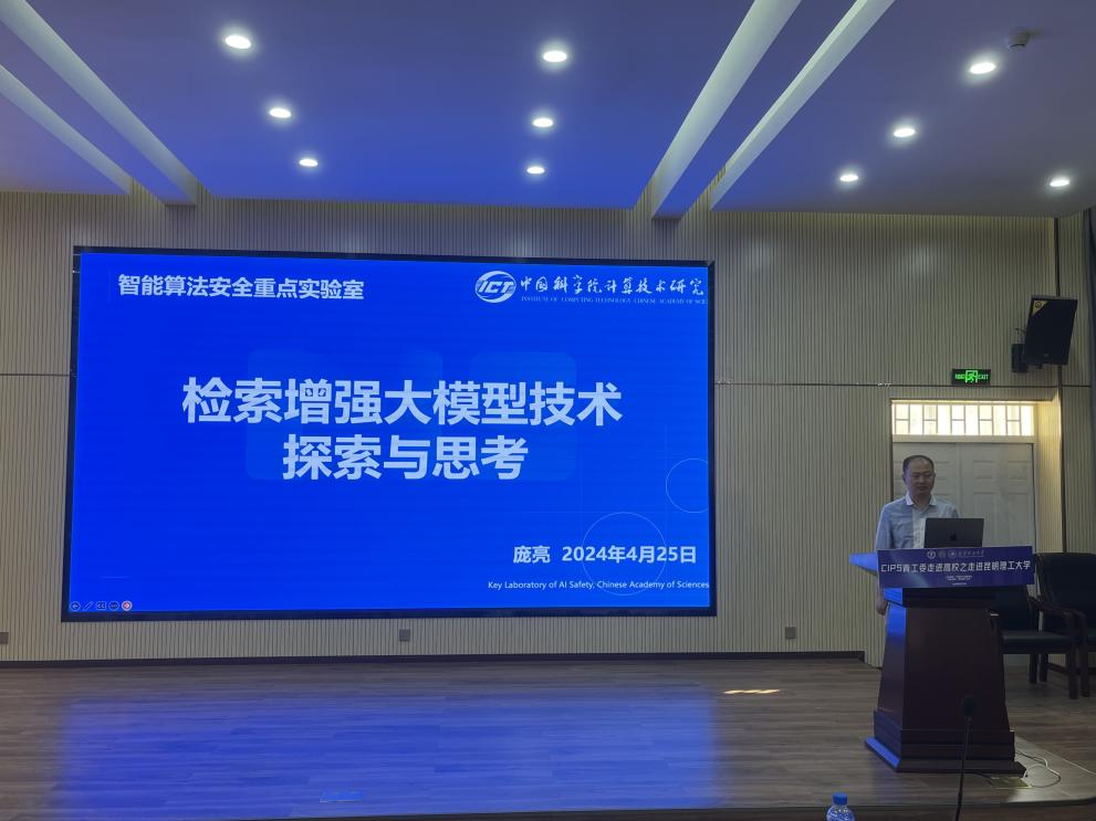庞亮副研究员报告题目是“检索增强大模型技术的探索与思考”。近年来,检索增强的范式有效地提升了大语言模型生成内容的准确性和可信性,其核心组成可以分为信息检索模块和大语言模型生成模块。报告从不同视角探讨了检索增强大模型。在信息检索模块的视角,检索模型的领域可泛化性和通用性,有助于在大模型应用的各个领域精选出对生成有效的信息;在大语言模型模块的视角,对外部信息使用的鲁棒性和效率,有助于避免检索噪声信息对生成结果的影响;在模块间交互的视角,信息检索模块与大语言模型模块交互配合的机制设计,也是成败的关键;最后,在检索增强生成信息回路的视角,新生成的内容将对信息检索造成潜在影响。