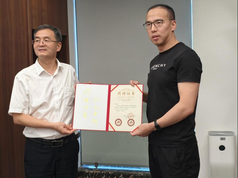 98级计算机科学与技术专业胡玉彪校友向学校领导汇报了公司主营业务和近年来发展情况,并签订了捐赠协议,潘学军代表学校感谢校友捐赠义举,并向胡玉彪校友颁发捐赠证书及学校建校70周年文创产品。