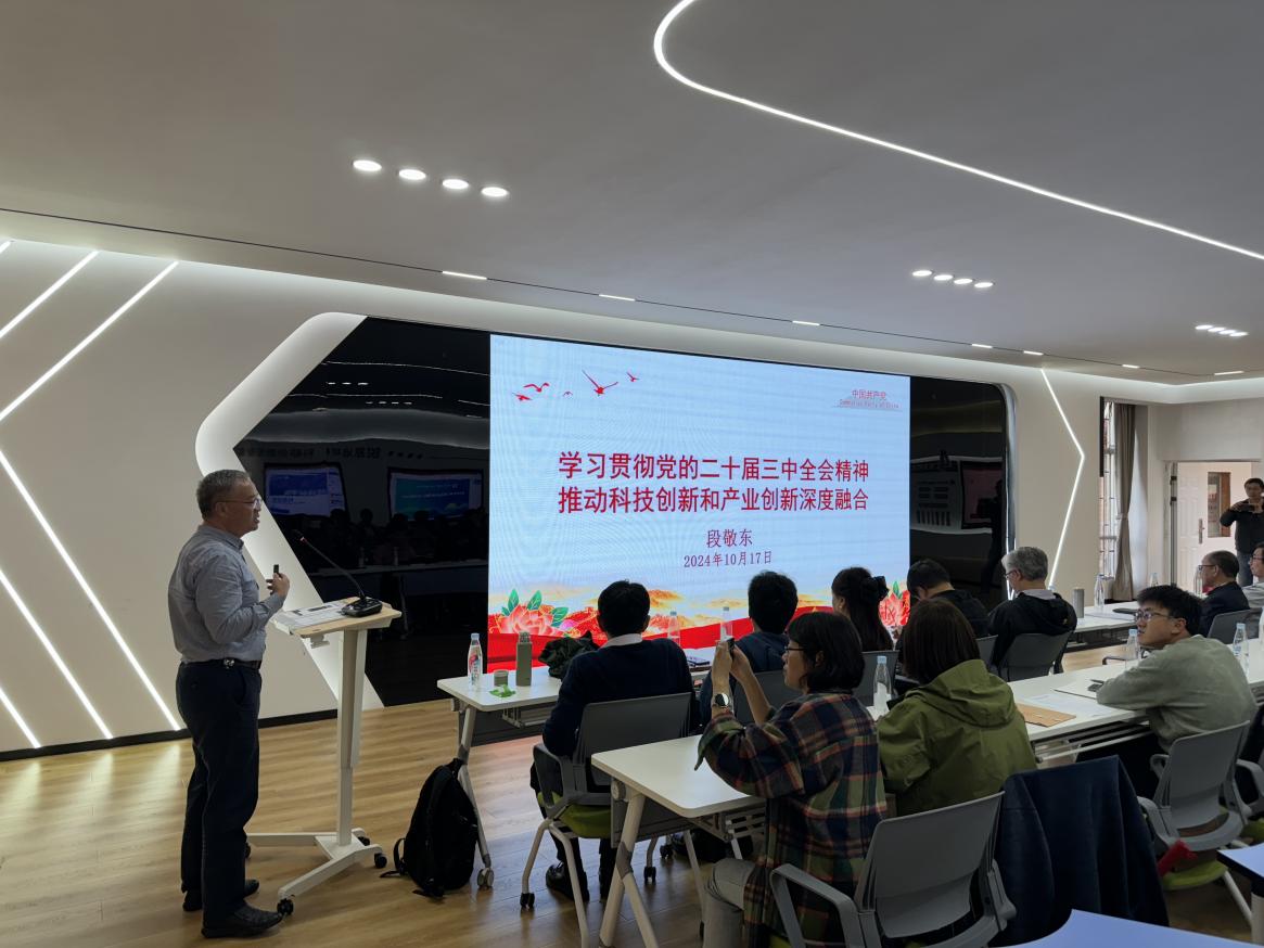 王红斌院长领学《党的二十届三中全会<决定>学习辅导百问》中关于“构建支持全面创新体制机制”的内容以及习近平同志《论教育》;由资产经营公司段敬东书记作“学习贯彻党的二十届三中全会精神推动科技创新和产业创新深度融合”为主题的重点发言;最后全体与会人员参观了云南省人工智能重点实验室。