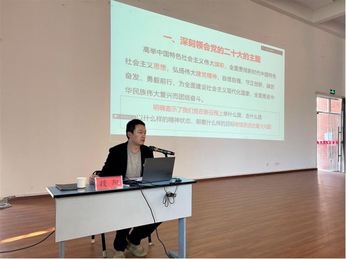 马克思主义学院段阳老师做了题为《以中国式现代化全面推进中华民族伟大复兴——深入学习贯彻党的二十大精神》的主题培训。段阳老师带领全体党员原原本本,逐字逐句的学习党的二十大报告和党章,学习领会党的二十大精神。段阳老师说到,当前世界百年未有之大变局加速演进,世界进入新的动荡变革期。前进道路上,我们必须牢牢把握坚持和加强党的全面领导,党的二十大就新时代新征程党和国家事业发展制定了大政方针和战略部署,蓝图已经绘就,全体党员同志要团结一心,自信自强、守正创新,踔厉奋发、勇毅前行,为全面建设社会主义现代化国家、全面推进中华民族伟大复兴而团结奋斗。
