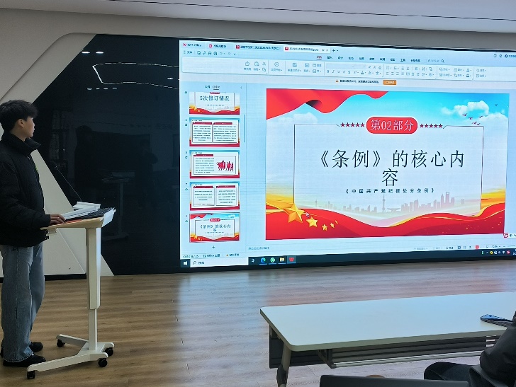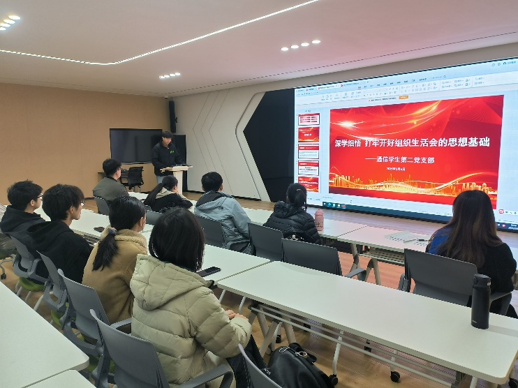 为持续深入学习贯彻习近平新时代中国特色社会主义思想及党的二十届三中全会精神,学习领会习近平总书记最新重要讲话精神与重要指示批示精神,以及深入学习党章、《中国共产党纪律处分条例》等相关规定,通信学生第二党支部于2025年3月6日在信自126教室举办了“深学细悟 打牢开好组织生活会的思想基础”主题党日活动,旨在引导党员深刻认识加强党的纪律建设对于推动全面从严治党向纵深发展、维护党的团结统一、不断增强党的创造力、凝聚力和战斗力的重大意义。