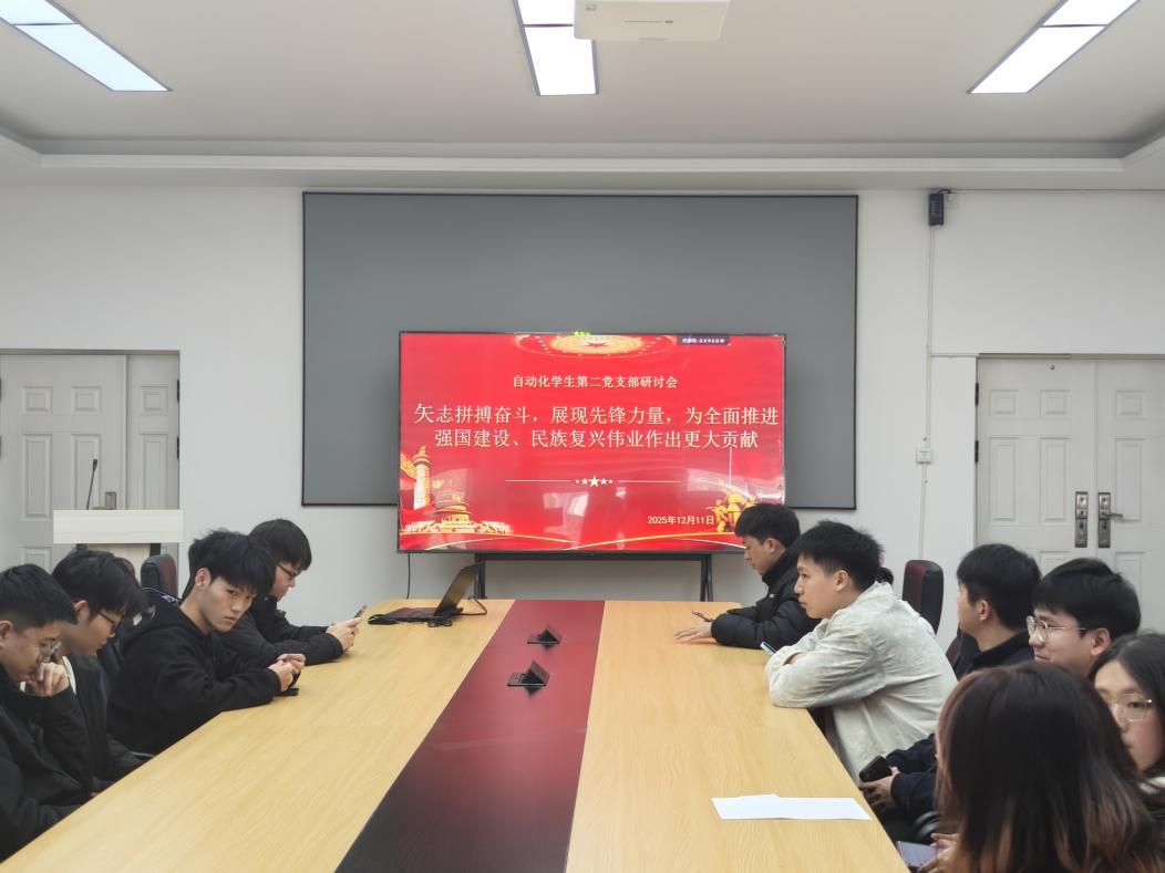 为深入学习贯彻党的二十届四中全会精神,认真落实学校党委决战冲刺“双一流”创建决策部署,切实推动党支部在总结中坚定信念、在查摆中明确方向。自动化学生第二党支部严格遵照学校党委组织部工作要求,于2025年12月11日开展 “总结提升促发展,凝心聚力向未来” 主题党日活动。此次活动由学生党员代表主持,支部全体党员及预备党员共同参与,以学促思、以研促干,旨在筑牢思想根基、凝聚奋进力量。