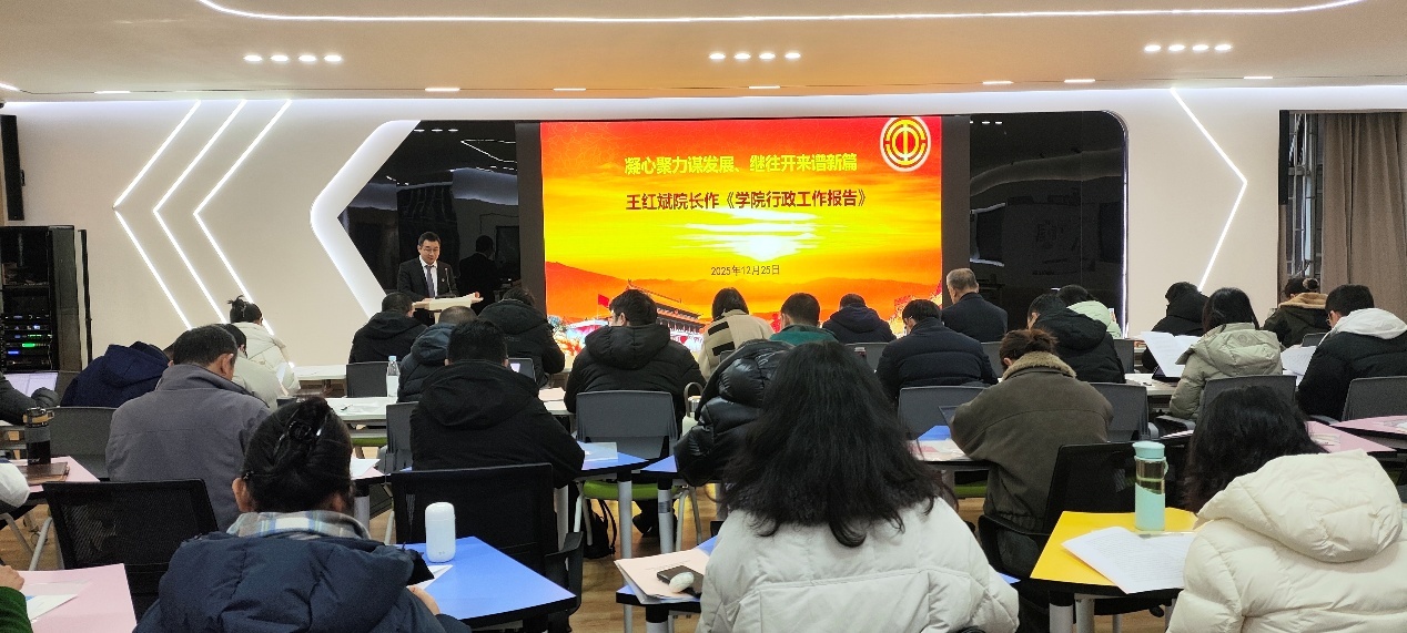 大会由学院党委书记齐毅主持,现场气氛庄重热烈。伴随着雄壮激昂的国歌声,第一次全体会议正式拉开帷幕。学院院长王红斌以“凝心聚力谋发展、继往开来谱新篇”为题作《学院行政工作报告》,系统回顾了“十四五”期间学院在学科建设、人才培养、科学研究、社会服务、国际交流、管理服务等领域取得的一系列标志性成果,全面擘画了 “十五五” 时期学院在优化学科布局、深化人才培养改革、强化师资队伍建设、提升科技创新能力等方面的发展蓝图。同时,王红斌院长还向大会作了《学院经费使用情况报告》,详细通报了经费收支明细与使用成效,接受全体代表监督。
