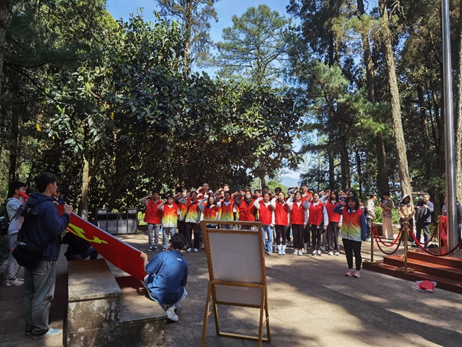 青山埋忠骨,清明悼英魂。活动中,师生列队肃立,奏唱国歌,集体默哀。由教师党员陈玉婷带领师生党员重温入党誓词,讲述聂耳墓陵园的历史。师生瞻仰革命烈士纪念碑,表达对革命烈士的深切怀念和崇高敬意,追思先烈丰功伟绩,缅怀英雄峥嵘岁月。