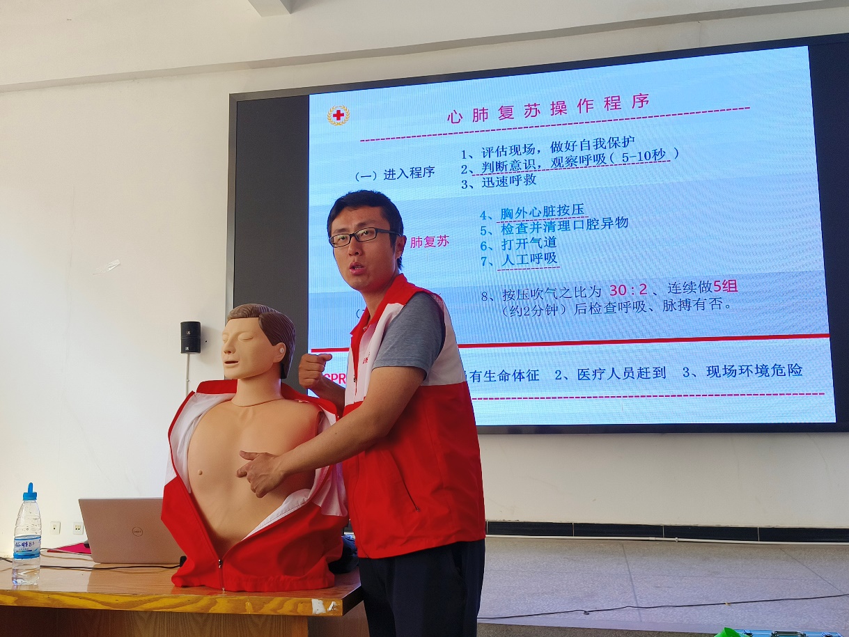讲座第二阶段呈贡区红十字会赵伟鸿老师利用通俗易懂的语言讲解了心肺复苏的理论知识和重要性,并重点展示了实际操作流程,分步骤演示如何调整体位、打开气道、判断呼吸、人工呼吸、胸外心脏按压等急救法。同时赵伟鸿老师也向同学们讲授了创伤止血与包扎方法及海姆立克急救法。
