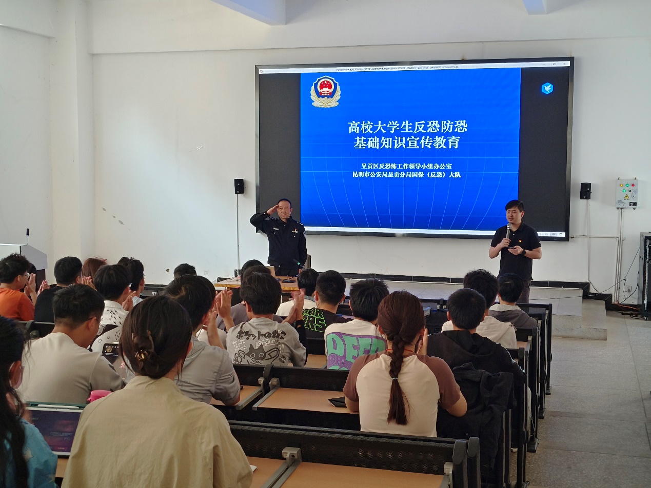 在计算机重点实验室100报告厅开展了安全教育宣传月活动——“反恐”与应急救援知识讲座。本次活动邀请到昆明市公安局呈贡分局国保大队副队长莫勉警官以及呈贡区红十字会志愿者赵伟鸿,对“反恐”和应急救援知识进行讲解。学院各班班委及学生代表150余人参加了本次讲座。