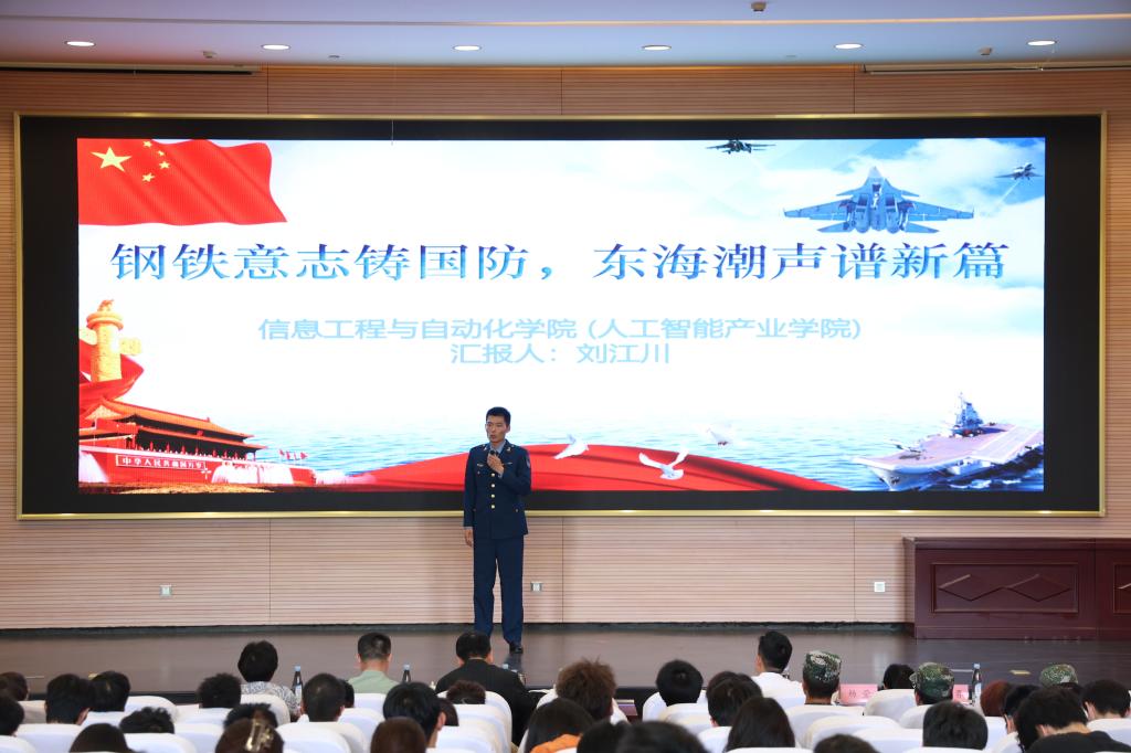 刘江川同学以《钢铁意志铸国防,东海潮声谱新篇》为题,生动讲述了自己在服役期间的难忘故事。他用饱含深情的语言,将军营里的热血拼搏与坚定担当娓娓道来,淋漓尽致地展现了青年学子对国防事业的深切热爱,赢得了现场评委和观众的热烈掌声。