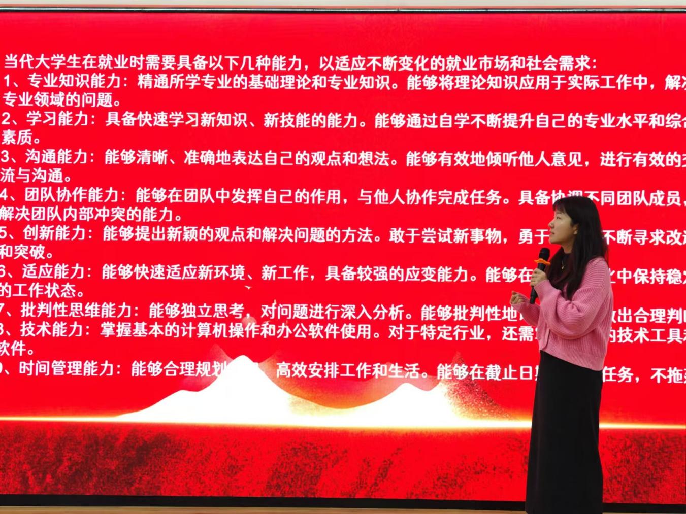 团委书记万松一方面通过分享往届优秀毕业生的就业案例,引导广大青年学生树立正确就业观,去祖国最需要的地方建功立业;另一方面通过对比分析不同历史时期青年的奋斗轨迹,指出了持续奋斗、不断学习的重要性,鼓励同学们面对就业挑战时秉持积极乐观的态度。