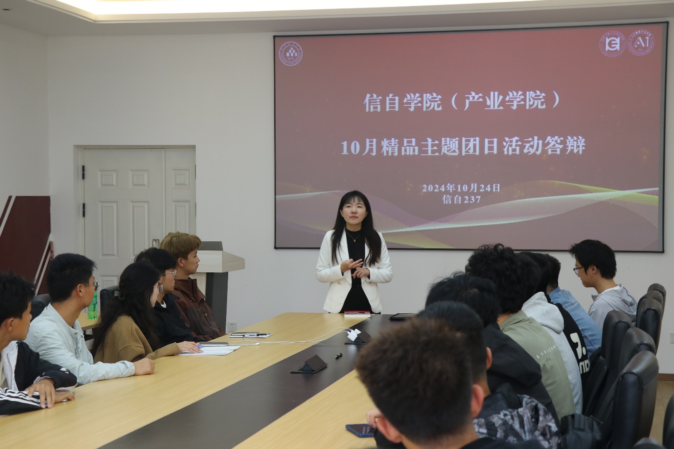 (产业学院)团委在信自楼237会议室开展十月精品主题团日活动评选答辩。本次答辩邀请到学院团委书记万松作为评委,2024级各班团支书参加。