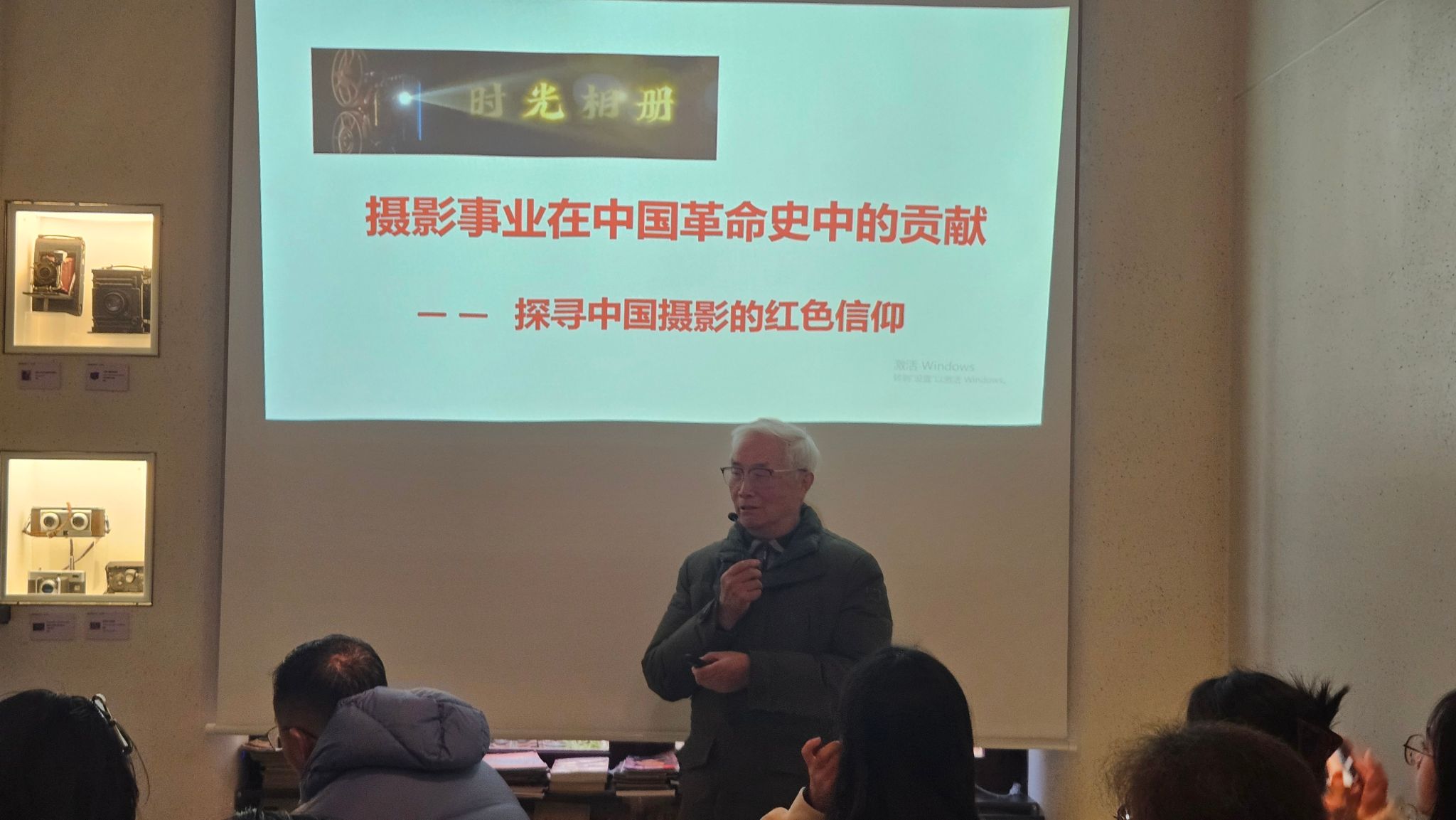活动伊始,古相机艺术博览馆馆长暨我校1967届农学系校友吴琴生教授通过古相机及其背后的红色故事,为党员们呈现了一堂生动而深刻的红色党课。吴琴生详细讲述了这些照相机也是历史见证者的由来、型号及背后的红色故事:中国革命新闻摄影第一人沙飞用2万张照片定格了中华民族抗日战争的珍贵瞬间;建筑学家梁思成和林徽因团队借助高兹折叠相机开展调研,为我国的国徽设计提供关键技术支持;革命烈士李白等以秘密电台传递情报,其工作原理同样包含摄影与通讯;每一台古相机,凝固着战场的烽烟与生活的侧影;每一张老照片,铭刻着民族的苦难与精神的信念。它们共同承载着一段不可磨灭的历史,传承着一份历久弥新的精神。