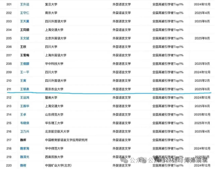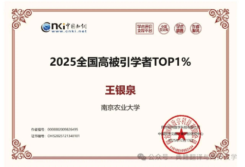 近日,中国知网学术评价支撑平台"高被引学者"专题页面正式发布"2025年全国高被引学者"榜单,南京农业大学共有108位教师荣登该榜单Top1%,充分彰显了学校在各学科领域的深厚学术积淀与强劲创新活力。其中,我院王银泉教授再度入选外国语言文学一级学科高被引学者Top1%名单,这是他继2024年首次入选后的再度上榜,标志着其学术影响力获得学界持续认可。