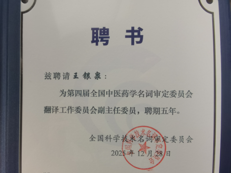 12月28日,全国中医药学名词审定委员会翻译工作委员会(以下简称翻译工作委员会)成立大会在北京召开。我院王银泉教授参会并获聘副主任委员,这是我院学科建设、科学研究与社会服务方向取得的一个重大成就。中国中医科学院院长、中国工程院院士、第四届全国中医药学名词审定委员会主任委员黄璐琦,全国科学技术名词审定委员会专职副主任兼事务中心主任裴亚军,国家中医药管理局国际合作司副司长魏春宇出席会议成立大会。中国中医科学院中国医史文献研究所所长、第四届全国中医药学名词审定委员会副主任委员甄艳主持会议。来自全国各地的专家学者共计50余人参加会议。黄璐琦院士为主任委员、副主任委员和委员一一颁发聘书。