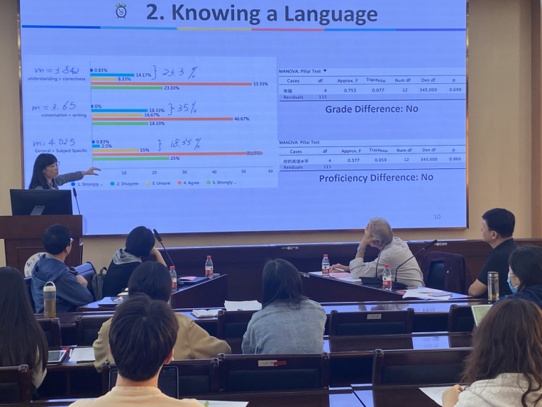 贾雯分享了问卷调查结论。她对南农外国语学院120名英语专业学生对语言的准确性、流利性和批判性思维三个问题的看法与认知进行了调研,分析了本科与硕士学生的认知异同,并在调查结果基础之上提出了培养学生批判性思维的教学方法与途径。