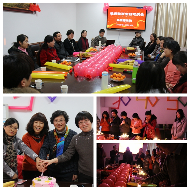 12月29日下午四时许,外国语学院会议室E302室传来了阵阵欢声笑语。从室外的一道彩虹花簇门望进去,“外国语学院教职工整岁生日欢庆会”几个红色大字映入眼帘,墙上用气球拼成的“30”、“40”、“50”字样窃窃私语,悄悄琢磨着寿星的模样。桌上的两排红色气球格外醒目,旁边精致地点缀着小花小朵;桌子一头组成“生日快乐”字样的花瓣早已守候在那里,讨喜地传送着祝福。