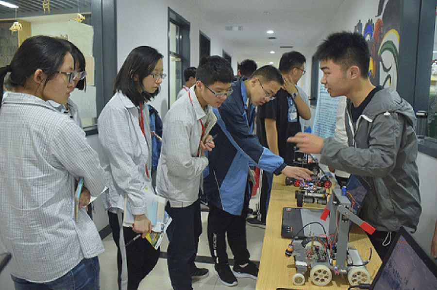 5月5日上午,在江苏省锡山中学科创节开幕之际,我校无锡地区招生宣传组成员外国语学院党委副书记董红梅、辅导员甄亚乐、杨瑞萌及工学院4名学生志愿者来到省锡中开展“科技作品进中学”活动。