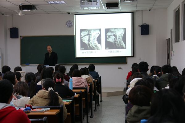题为“日语声调在句子中的体现”的学术报告吸引了数百名日语系师生。朱春跃老师以日语中最基本的假名发音为对象,将日本人的发音和学习日语的中国人的发音进行比较。整个报告过程中,朱老师利用最先进的声音分析软件,从图、音、形多方面进行了对比分析。就日语的元音、辅音、清音、摩擦音等一一探讨,讲座深入浅出、娓娓道来,最后还邀请学生上台,亲身体验声音分析软件,赢得在场听众的一致好评与共鸣。